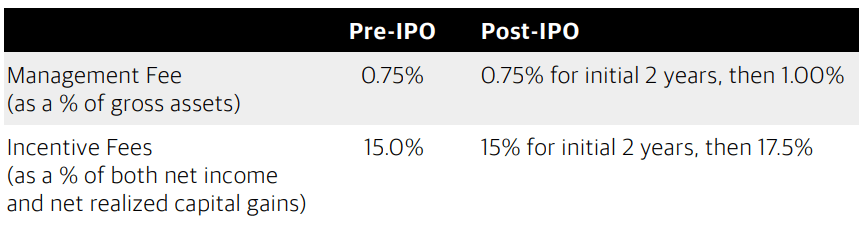 The Adviser and the company entered into a new advisory agreement to include a three-year total return lookback feature on the income-based incentive fee, which provides that following the IPO, the incentive fee on income will be subject to a twelve-quarter lookback quarterly hurdle rate of 1.50% as opposed to a single quarter measurement and will become subject to an incentive fee cap based on the company’s net cumulative return. While under the company’s advisory agreement the management fee and incentive fees paid to the Adviser would have increased following the IPO, the Adviser is waiving the increase in these fees for two years. This means for the first two years following the IPO, the management fee will remain at 0.75% and incentive fees will remain at 15%, then step up to 1.00% and 17.5%, respectively, as shown below: