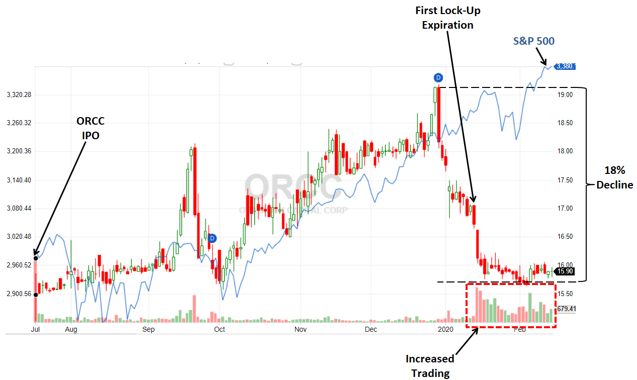 ORCC’s stock price started to decline after the Q4 2019 ex-dividend date and then through the first lock-up expiration. I have included the comparison with the S&P 500 that was headed higher at that time. ORCC was previously trading around $19.00 for a regular dividend yield of around 6.5% or 8.2% including the temporary special dividends (similar to BXSL currently yielding 5.7% or 7.5% with specials). However, the price quickly declined to just under $16.00 driving a more appropriate yield of 7.8% or 9.8% with the temporary specials.